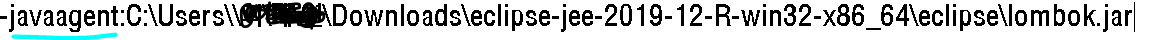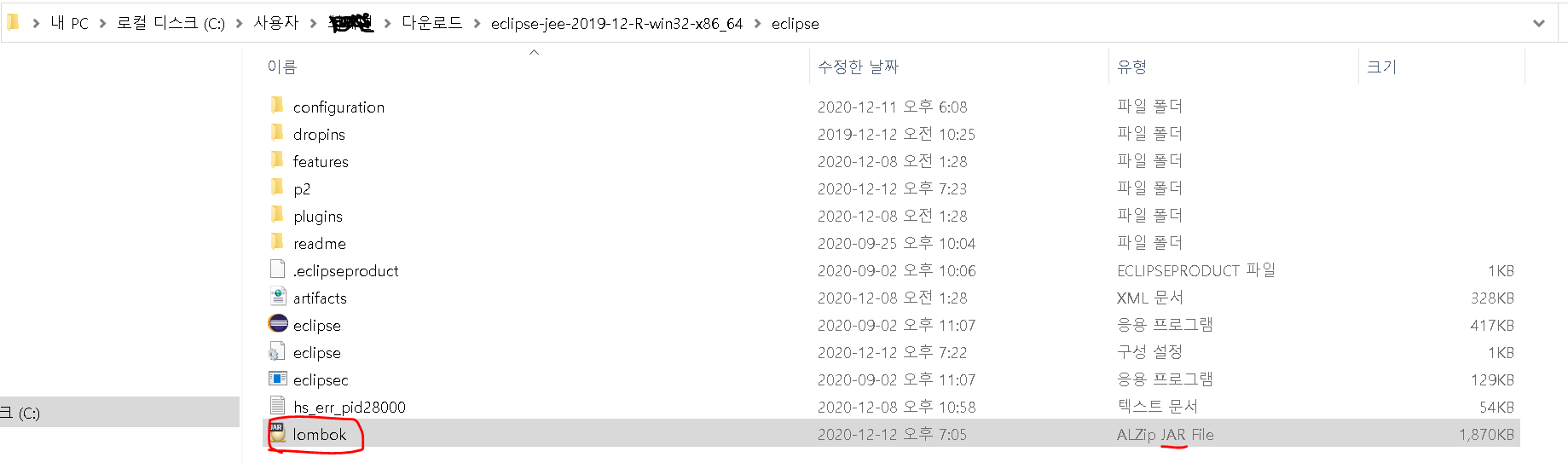 - 설치가 끝나면 Eclipse의 실행 경로에 lombok.jar 파일이 추가된 것을 확인할 수 있다.